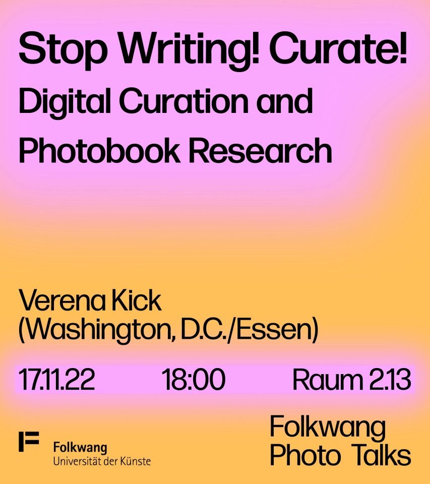 When defining Digital Humanities, it is often about how a research question can be approached with digital methods or tools. When thinking of digital curation (a part of Digital Humanities), at first the curation of exhibitions online may come to mind, which was a necessary step once the Covid-19 pandemic started to spread globally in 2020, and museums and other cultural institutions had to close to the public. Verena Kick’s contribution to the Photo Talk series is about a different kind of curation: neither museum curators nor archivists are the curators in this case, but scholars who curate their research in a digital way. In their act of digital curation, it is not only their primary work—in this case the photobook—that is curated online, but also their related research and argumentation.