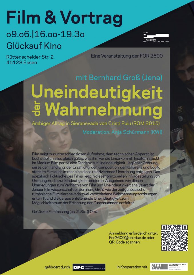 Film neigt zur unterschiedslosen Aufnahme; dem technischen Apparat ist buchstäblich alles gleich gültig, was ihm vor die Linse kommt. Insofern steckt im Medium Film per se eine Tendenz zur Uneindeutigkeit. Jeglicher Ordnung, sei es der Handlung, der Erzählung, der Komposition, der Kohärenz und Logik, steht im Film auch immer eine diese relativierende Unordnung entgegen. Das spezifisch Politische des Films liegt in dieser prinzipiellen Infragestellung von Ordnungen, die zur Eindeutigkeit tendieren. Ausgehend von diesen Überlegungen zum Verhältnis von Film und Uneindeutigkeit analysiert der Jenaer Filmwissenschaftler Bernhard Groß, wie der zeitgenössische rumänische Film sieranevada zwei verschiedene Wahrnehmungsordnungen entwirft und die daraus entstehende Uneindeutigkeit zum Möglichkeitsraum der Erfahrung der Zuschauenden entfaltet.